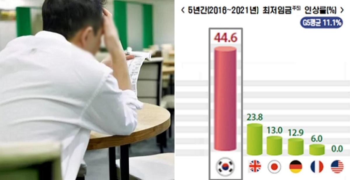 특히 최근 5년간(2016년~2021년) 한국의 최저임금 인상률은 44.6%로 G5(선진 5개국) 평균 인상률(11.1%)의 4배 이상인 것으로 나타났다.