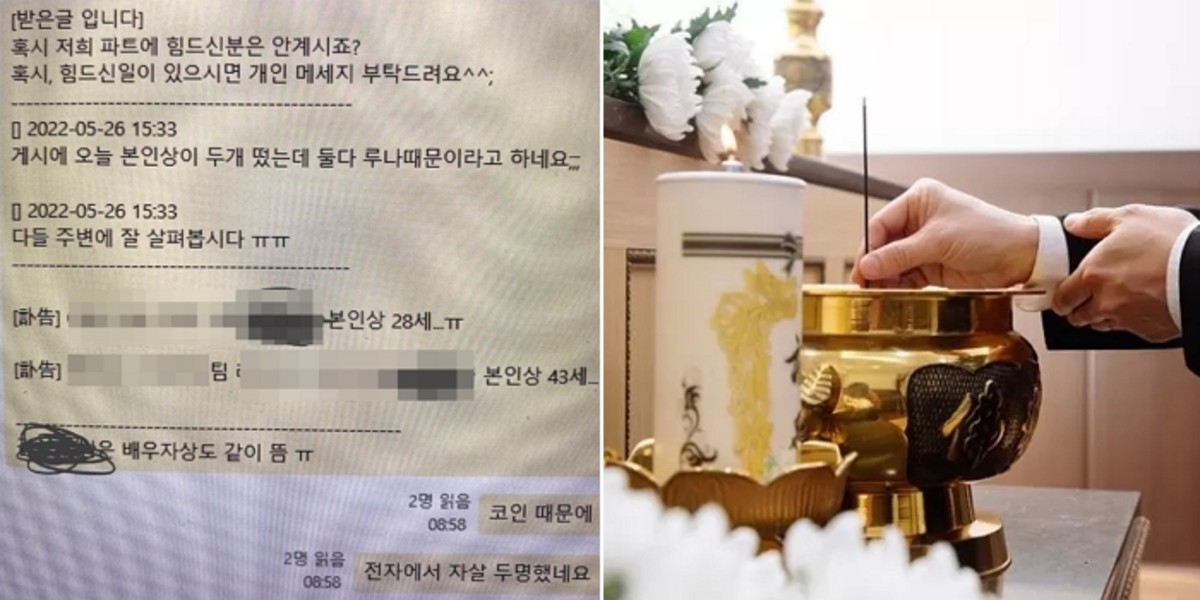이런 가운데 국내 모 기업의 사내 메신저를 통해 전달됐다는 부고 안내문이 온라인에서 확산했다. 안내문에는 루나 사태로 직원 두명이 극단적 선택을 했다는 내용이 담겼다.