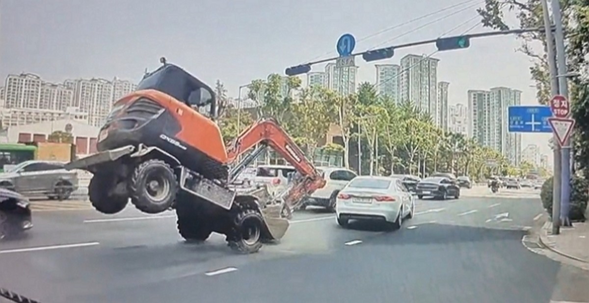 이에 뒤따라오던 굴착기가 급정거하면서 무게 중심이 앞으로 기울어졌다. 뒷 바퀴가 들려 공중에 뜨면서 전복될 뻔했다.