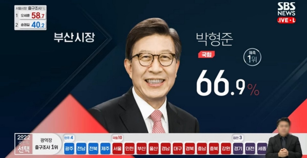 1일 KEP(KBS, MBC, SBS) 공동 출구조사에 따르면 박형준 국민의힘 부산시장 후보는 66.9%를 기록해 32.2%의 변성완 더불어민주당 부산시장 후보를 34.7%p 앞질러 압도적 우위를 나타냈다.