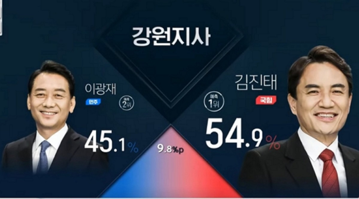 [인사이트] 박상우 기자 = 지상파 방송 3사 출구조사 결과 강원도지사 선거에서 국민의힘 김진태 후보가 예측 1위로 나타났다.