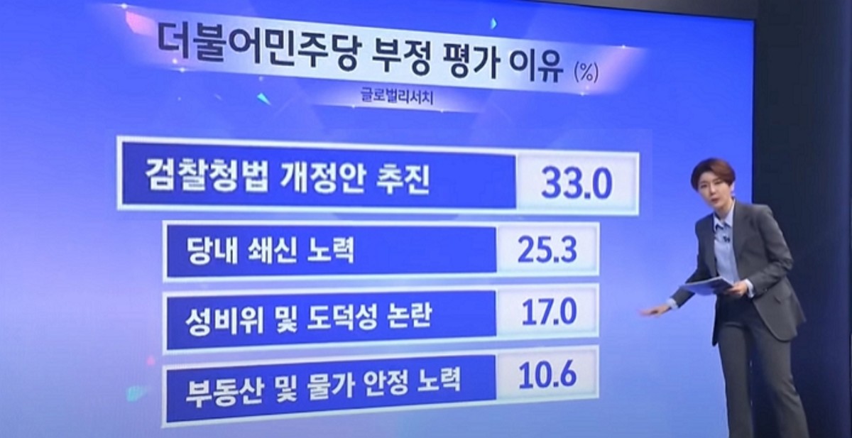 1일 글로벌리서치가 JTBC 의뢰로 조사한 '지방선거 지지도 및 정치지표 현안' 등에 따르면 더불어민주당 부정평가 1순위로 '검찰청법 개정안 추진'이 꼽혔다.