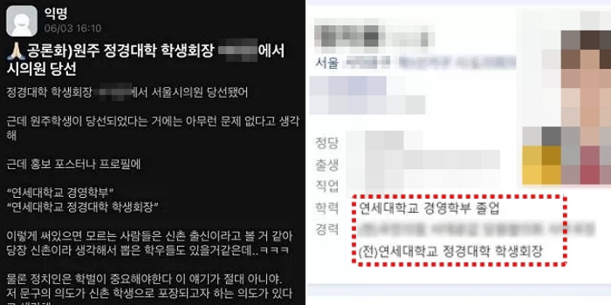해당 시의원 당선인의 홍보 포스터 프로필을 살펴보면 '(전)연세대학교 정경대학 학생회장', '연세대학교 경영학부 졸업'이라고 표기돼있다.
