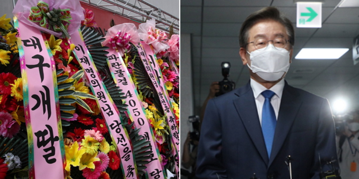 화환에는 "광주 개딸이 이재명 의원님의 당선을 축하드립니다", "이재명 당선을 진심으로 바랐습니다", "4050 푸른 물결", "재명이네 마을 주민", "이재명의 경기도가 자랑스럽다" 등의 문구가 담겼다.