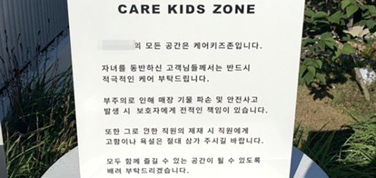 노키즈존이 아닌 케어키즈존이라 소개하는 한 가게의 설명문에는 아이 동반 고객의 적극적 자녀 케어를 부탁하는 말이 담겼다.