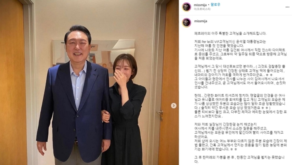 [인사이트] 성동권 기자 = 윤석열 대통령의 취임식 정장을 제작해 이름을 알린 페르레이 손미현(33) 대표가 자신의 SNS에 윤 대통령과 함께 찍은 기념사진을 올리며 후일담을 전했다.