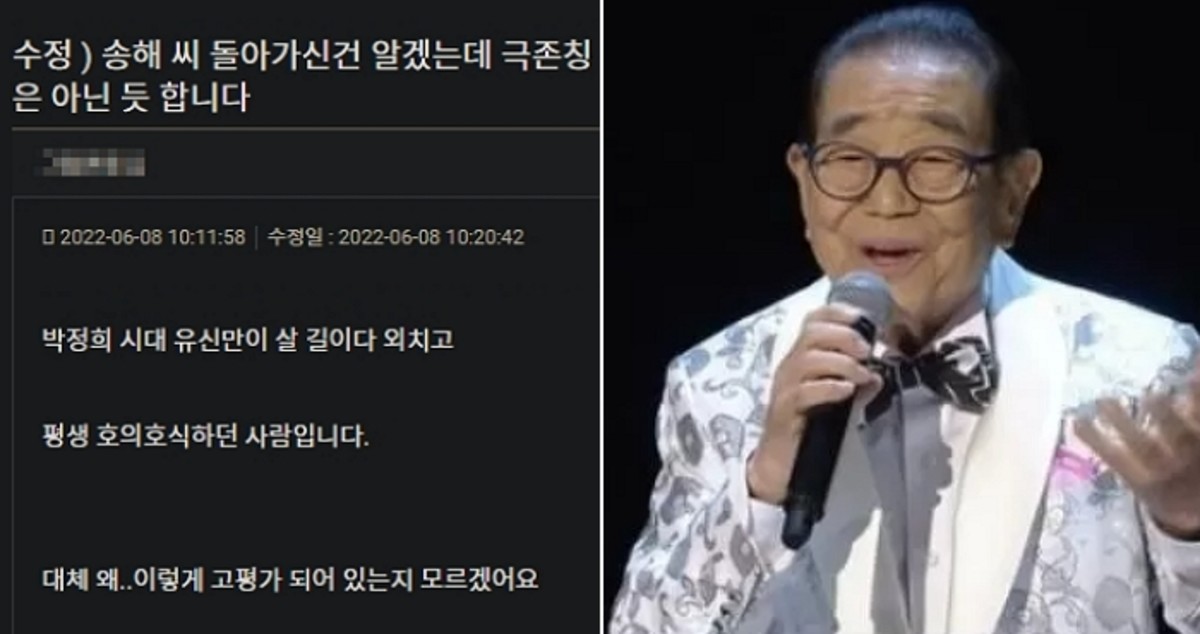 작성자 A씨는 송해 선생님의 과거 행적을 들며 "박정희 시대 유신만이 살 길이다 외치고 평생 호의호식했던 사람"이라고 평가했다.