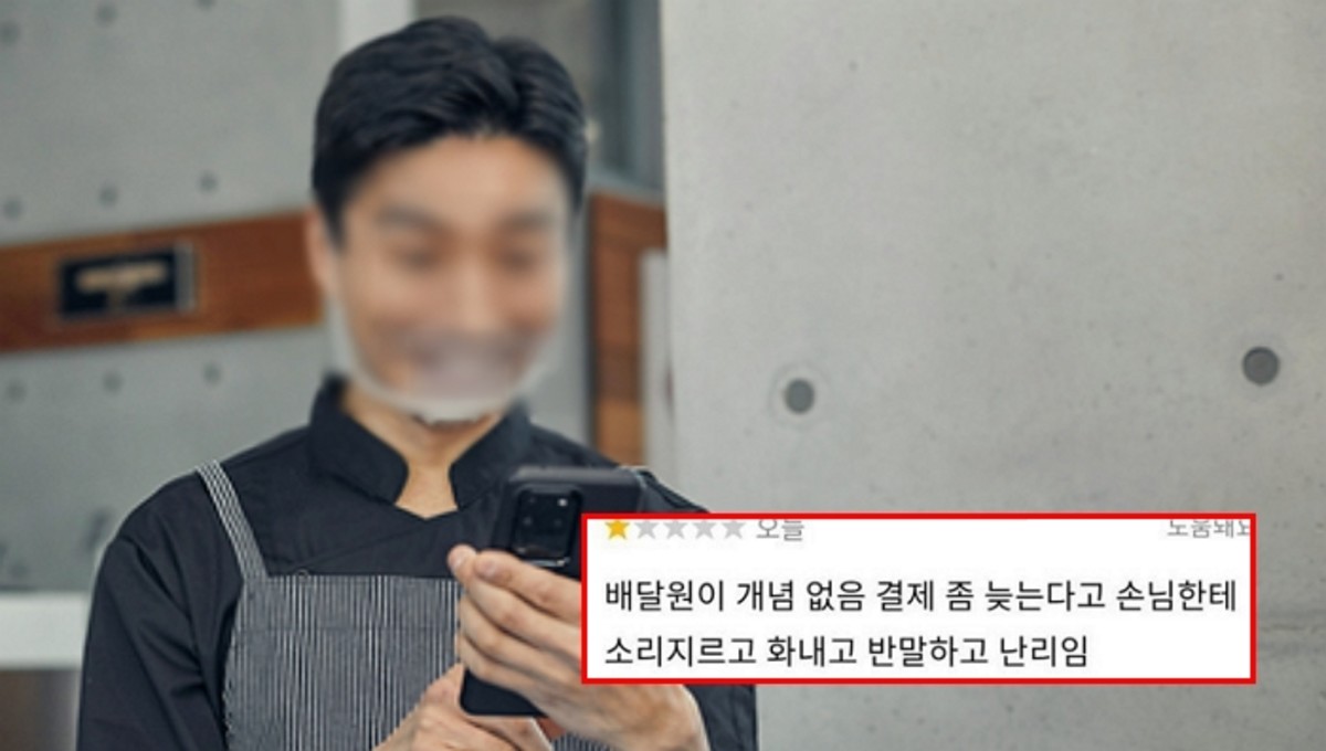 해당 사진에는 "배달원이 개념 없음. 결제 좀 늦는다고 손님한테 소리 지르고 화내고 반말하고 난리임"이라며 별점 1개를 남긴 고객의 리뷰와 사장님의 댓글이 담겨 있다.