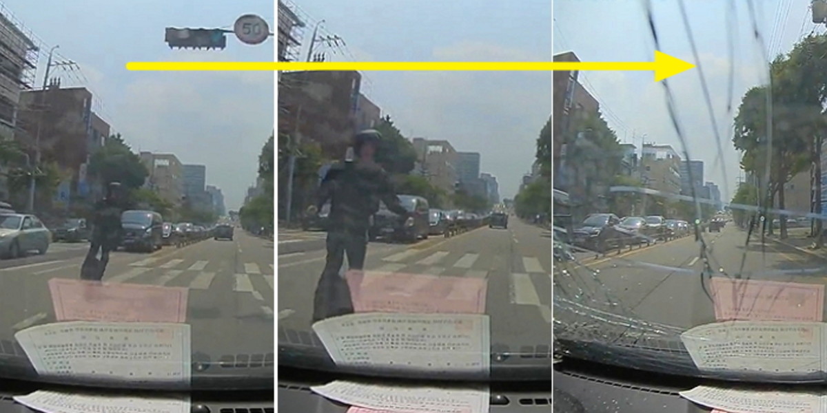 1차선이 아닌 2차선에서 불법 좌회전을 갑자기 했기에 사고를 피하기는 어려웠다. 비교적 빠르게 브레이크를 밟았지만 전동휠과 차량 간 충돌은 결국 일어났다.
