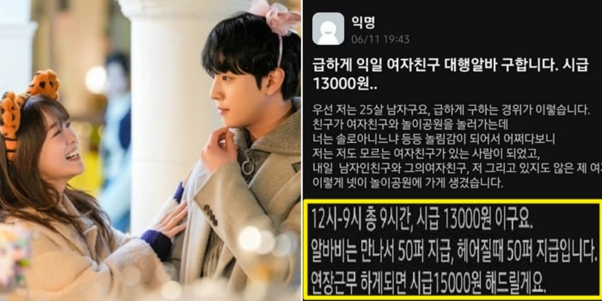 지난 11일 대학생 익명 커뮤니티 '에브리타임'에는 "급하게 익일 여자친구 대행알바 구합니다. 시급 13000원"이라는 제목의 글이 올라왔다.