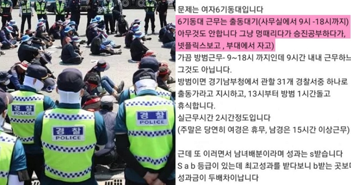 그는 여자기동대인 6기동대를 언급하며 "6기동대 근무는 출동대기다. 사무실에서 아무것도 안 한다. 멍때리다가, 승진 공부 하다가 넷플릭스 보고 부대에서 잔다"고 지적했다.