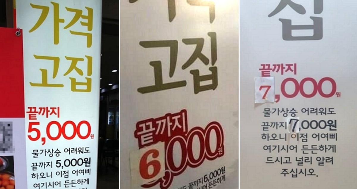 첫 번째 사진 속에 담긴 간판에는 '가격 고집 끝까지 5,000원'이란 문구가 눈에 띈다. 아래에는 "물가상승 어려워도 끝까지 5,000원 하오니 이점 어여삐 여기시어 든든하게 드시고 널리 알려주십시오"라고 적혔다.