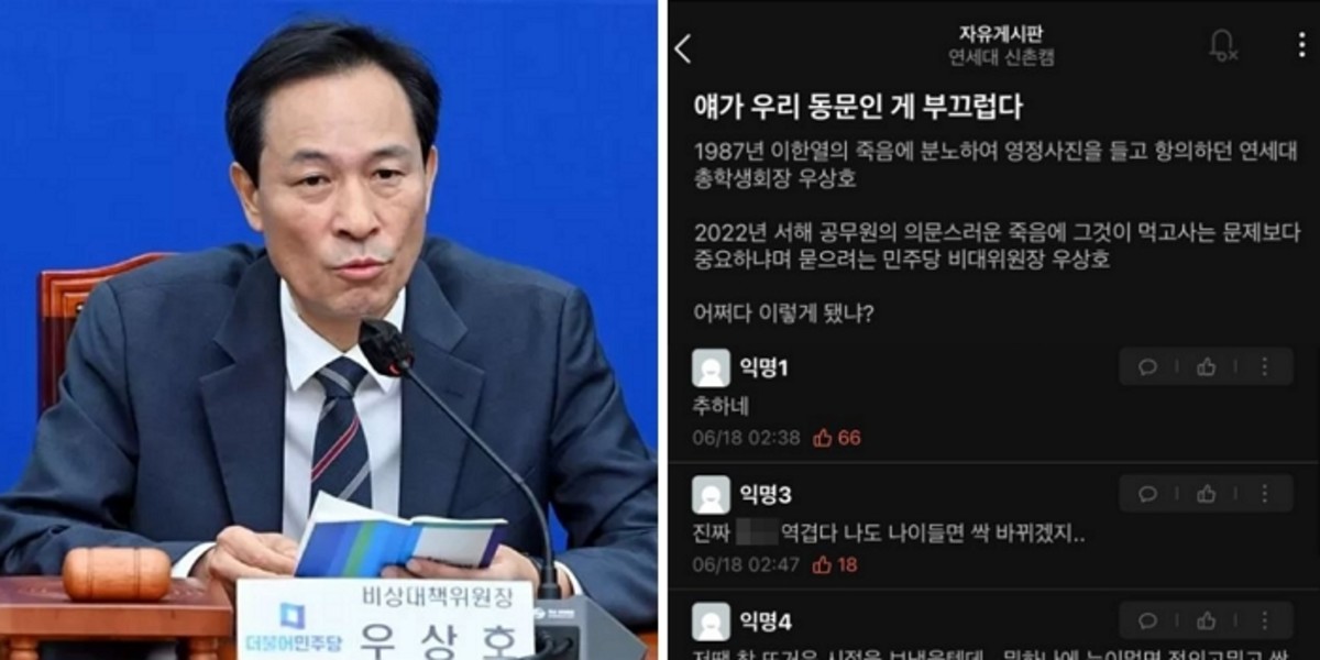 작성자 A씨는 "1987년 이한열의 죽음에 분노하여 영정 사진을 들고 항의하던 연세대 총학생회장 우상호, 2022년 서해 공무원의 의문스러운 죽음에 그것이 먹고 사는 문제보다 중요하냐며 묻으려는 민주당 비대위원장 우상호"라며 "어쩌다 이렇게 됐냐"고 했다.