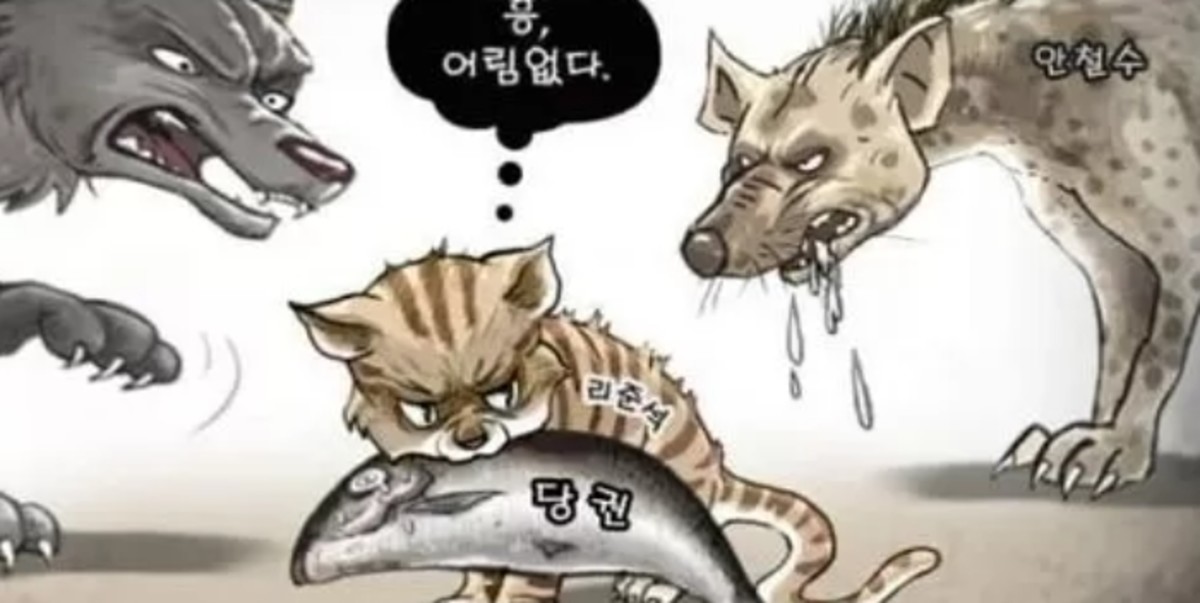 만평의 제목은 '쟁탈전'으로, 리준석이라고 적힌 고양이와 이를 노리는 늑대 '윤핵관(윤석열 핵심 관계자)', 하이에나 안철수가 나온다.