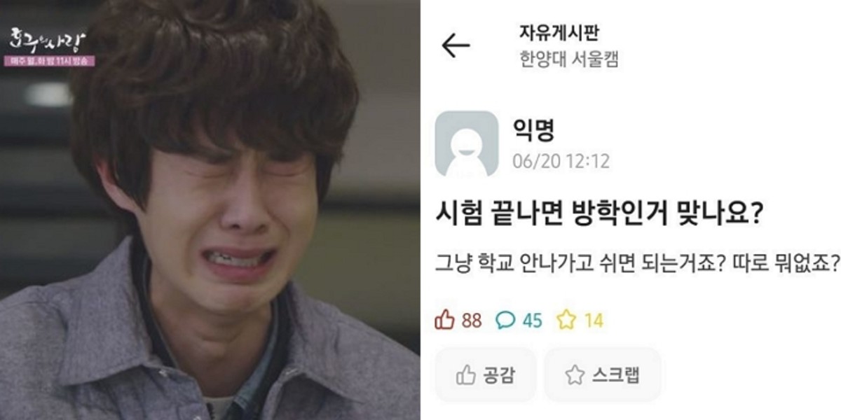 지난 20일 한양대학교 '에브리타임'에는 "시험 끝나면 방학인 거 맞나요?"라는 질문글이 올라왔다.