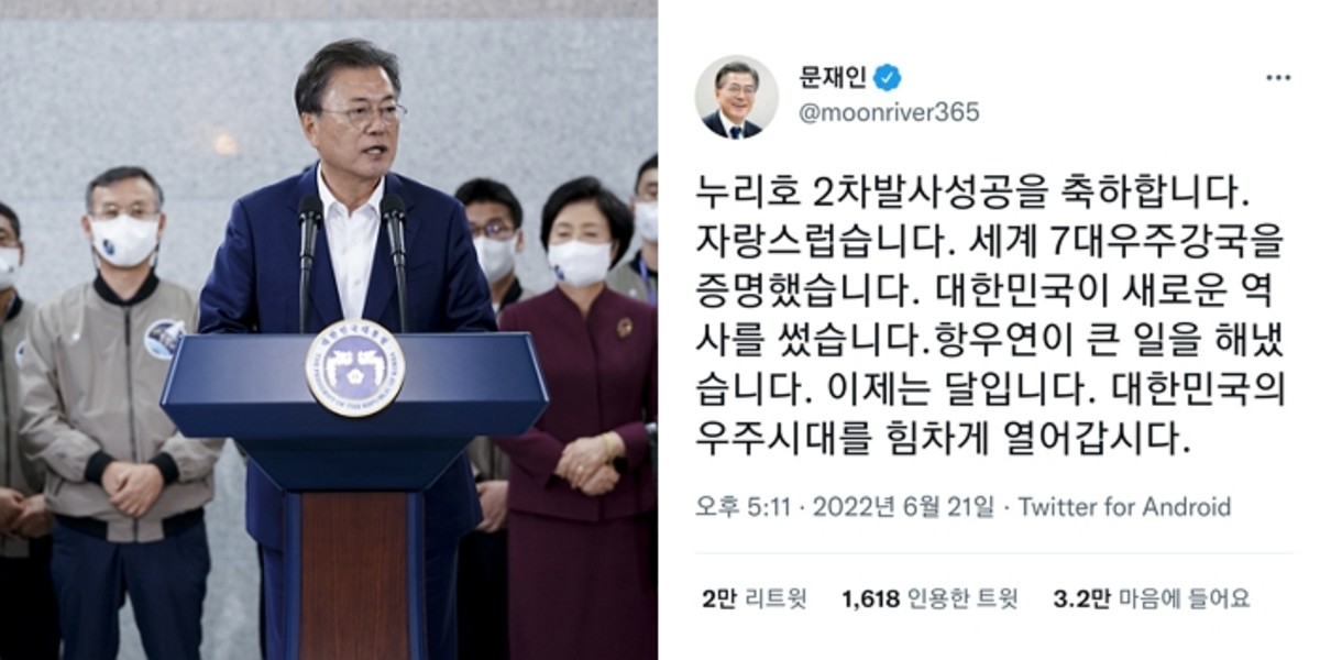 지난 21일 문 전 대통령은 페이스북과 트위터에 "누리호 2차 발사 성공을 축하합니다. 자랑스럽습니다"라는 글을 올렸다.