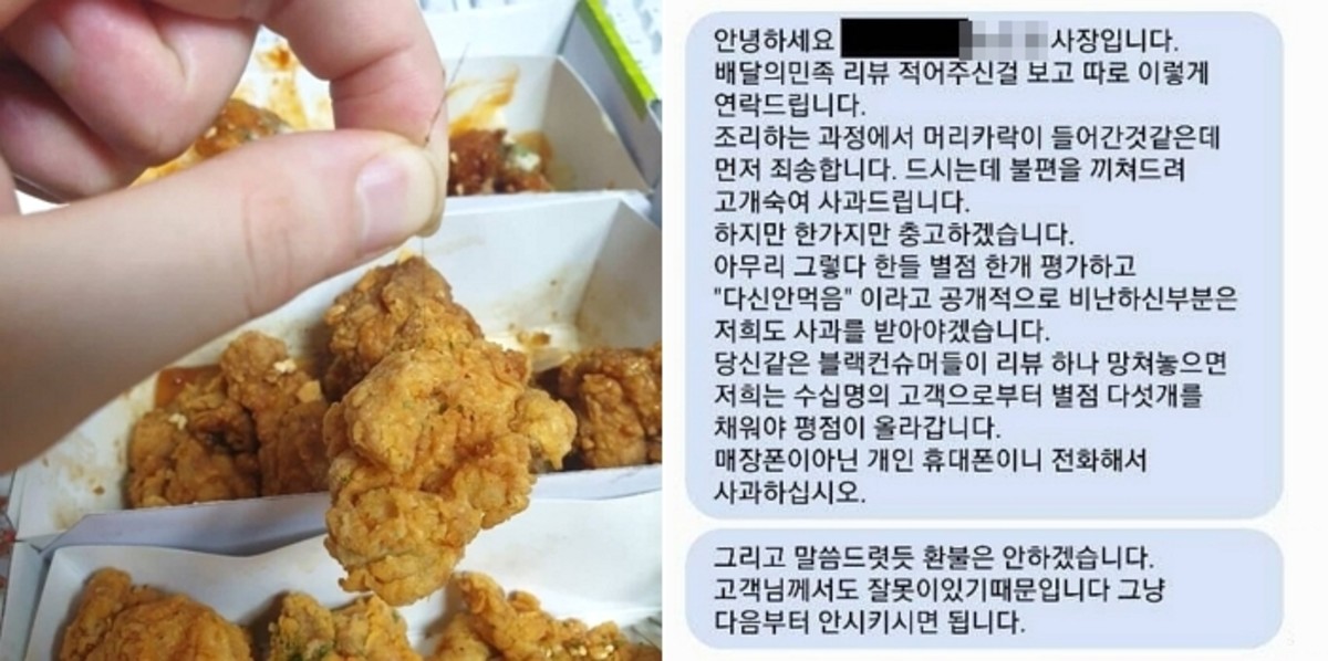[인사이트] 정현태 기자 = 배달 주문한 치킨에서 머리카락이 나와 별점 1개를 남겼다가 점주에게 황당한 연락을 받았다는 사연이 전해졌다.