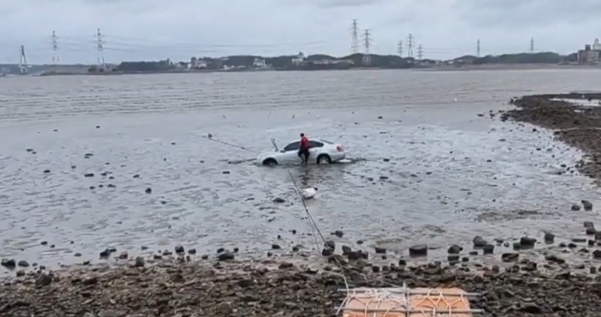 공개된 영상 속에는 SM5로 추정되는 차량의 앞바퀴가 갯벌 깊숙이 박혀 있는 모습이다.