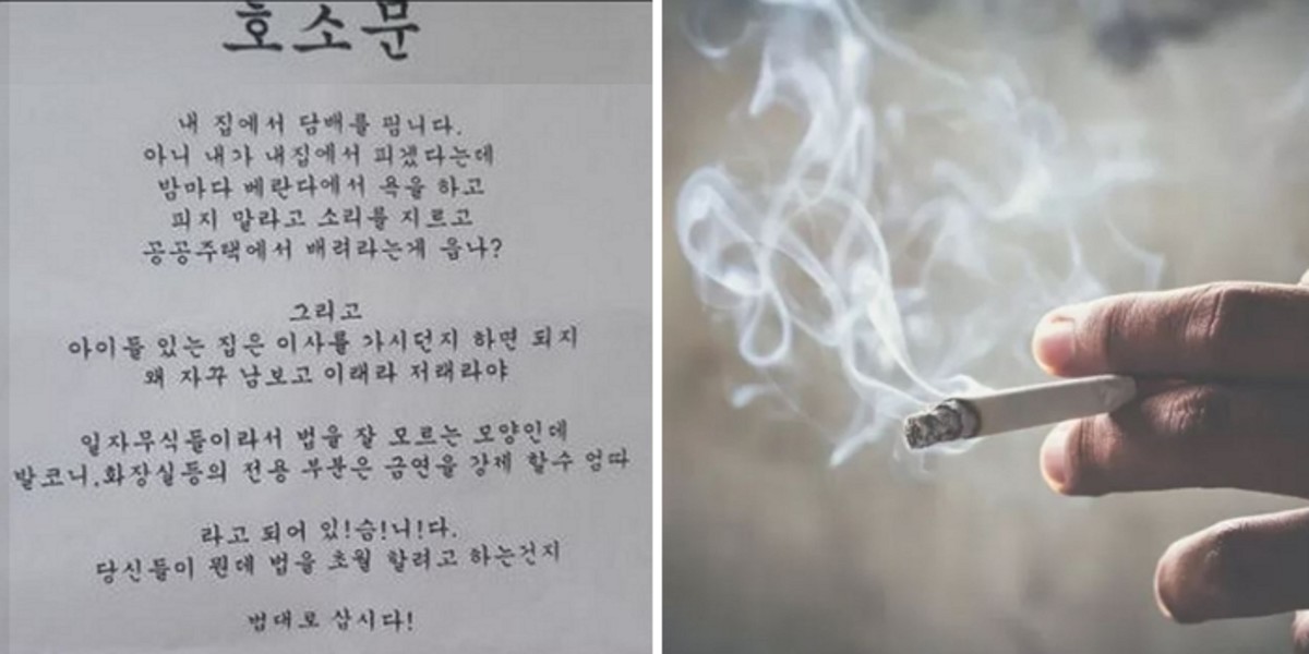 해당 호소문을 제보한 누리꾼은 "공동주택에서 이런 갈등이 많은데 '집안에서 창문 닫고 자유롭게 흡연하세요'라고 하면 '내 집 환기의 자유가 있다'고 답변한다"고 전했다.
