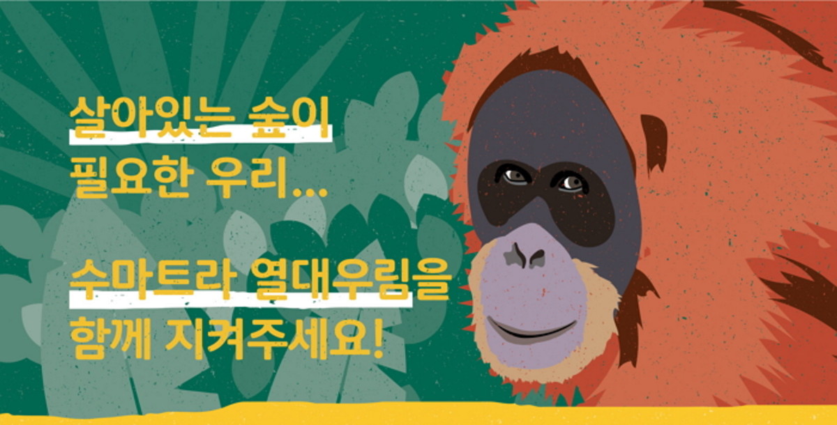 '여러분이 함께 지키는 오랑우탄의 고향. 수마트라 열대우림의 숨소리에 귀 기울여보세요'라는 문구가 적혀 있다. 함께 인쇄된 QR코드를 찍으면 웨스트 토바 숲 소리를 녹음한 음원을 감상할 수 있다.