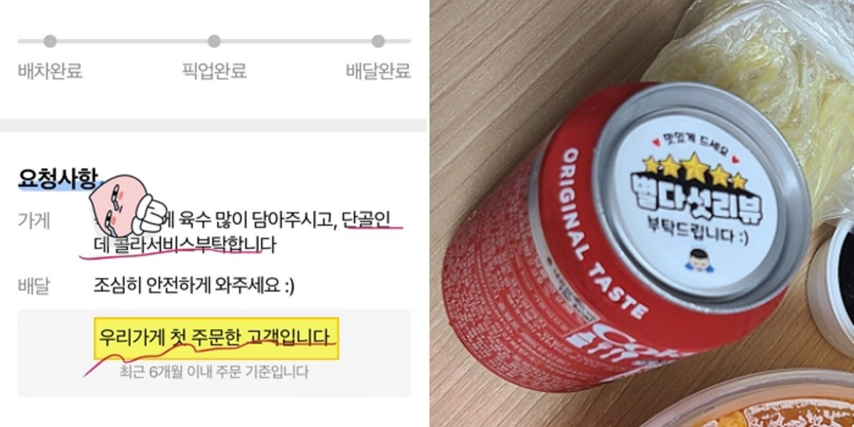 A씨가 함께 공개한 사진에는 배달 앱 주문내역이 담겼다. 고객은 음식을 주문하면서 "육수 많이 담아주시고, 단골인데 음료수 서비스 주세요"라고 적었다.