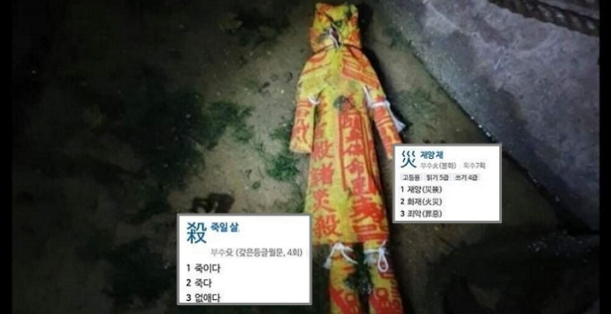 이날 A씨는 "낚시 왔는데 이거 뭐냐"며 '殺(죽일 살)', '災(재앙 재)' 등이 적힌 부적이 돌돌 감긴 저주인형을 촬영해 게재했다.