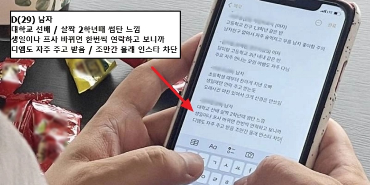 대학 선배 D씨에 대해서는 '과거 살짝 썸탄 느낌'으로 기록하는 한편 '연인과는 생일이나 메신저 사진이 바뀌면 한 번씩 연락하는 사이'라며 '조만간 몰래 SNS 차단해야겠다'고 기재했다.