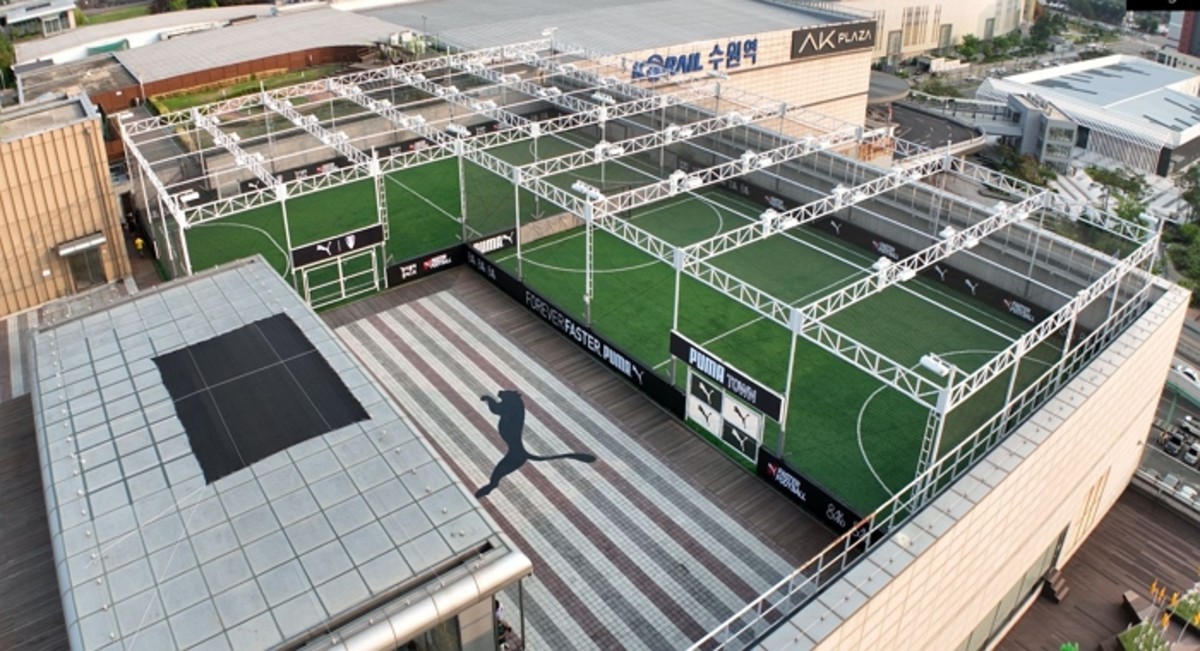 AK PLAZA 수원점 7층에 위치한 '푸마타운 수원'은 푸마가 서울 이외의 지역에 최초로 만든 브랜드 풋살장으로 푸마만의 콘텐츠를 만날 수 있는 공간으로 리뉴얼 되었다.