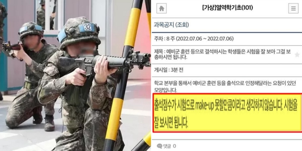 [인사이트] 박상우 기자 = 부산의 한 국립대 교수가 예비군 훈련에 가는 학생들의 출석을 인정해주지 않겠다는 공지문을 올려 논란이 일고 있다. 해당 교수는 논란이 불거지자 입장을 번복했다.