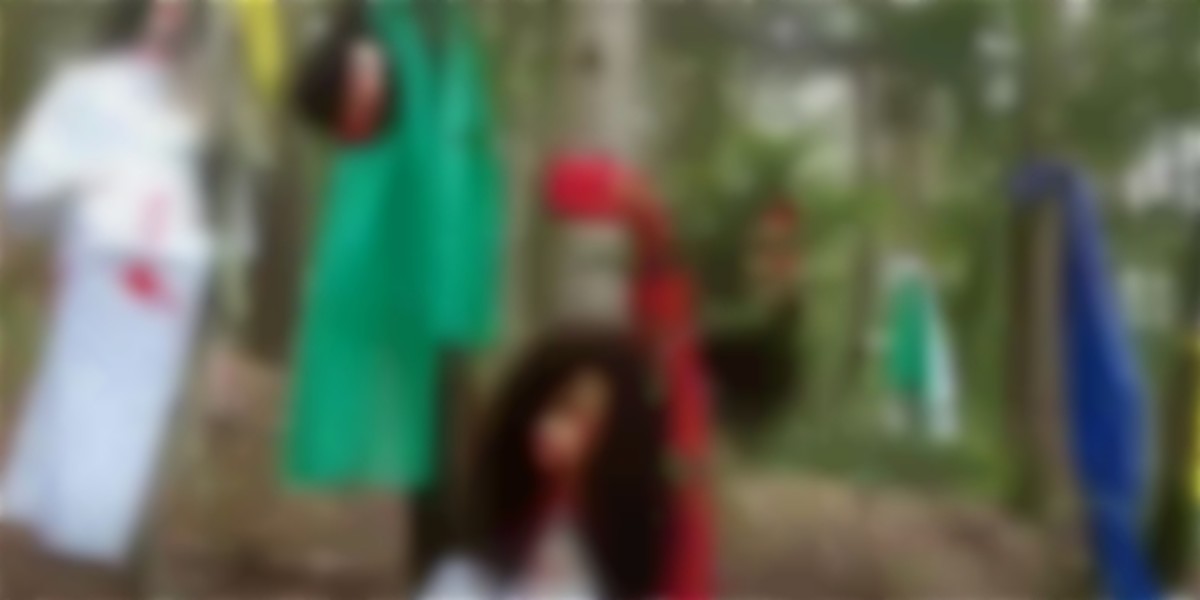 나무에는 소복을 입은 마네킹이 여러 개 내걸려 있다. 마네킹 곳곳에는 핏자국을 연상하게 하는 빨간 물감까지 발렸다.