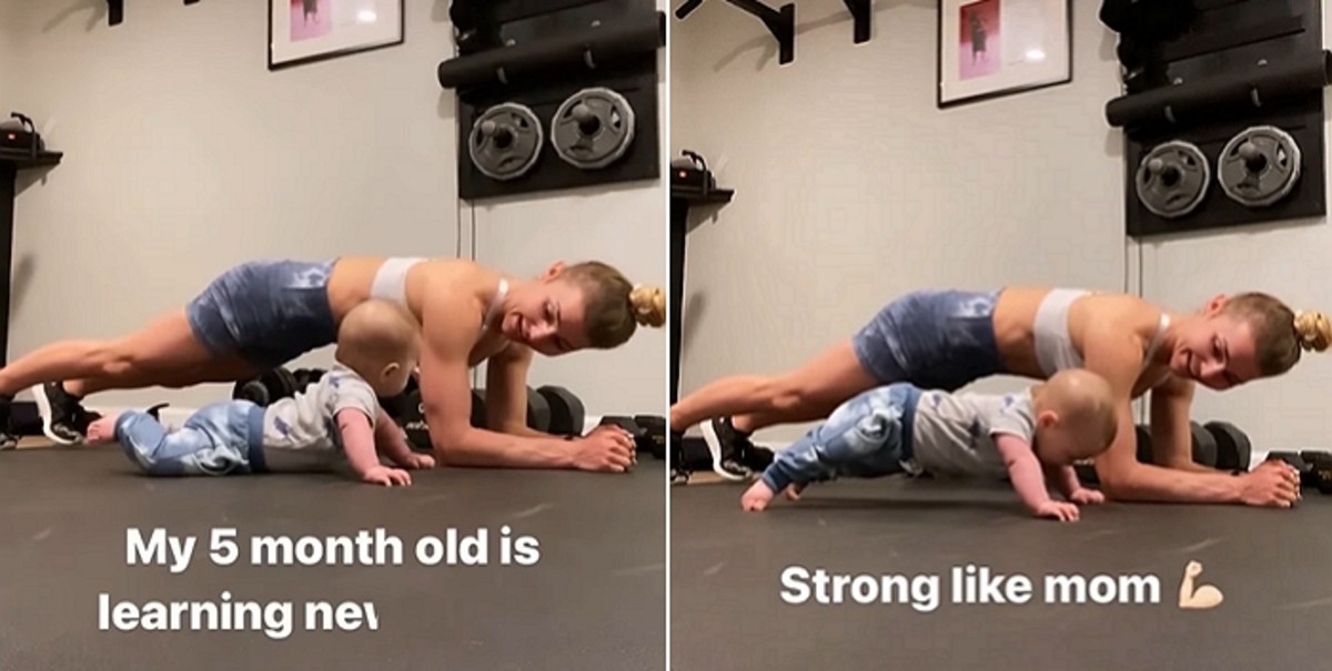 한 눈에 봐도 근육질 몸매를 자랑하는 엄마는 아이 옆에서 한 치의 흐트러짐도 없이 완벽한 플랭크 동작을 취하고 있다.