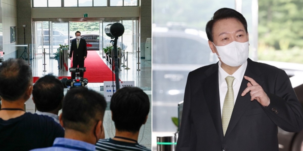 윤 대통령은 취재진과 멀찌감치 떨어져 '원거리 방식'으로 도어스테핑을 진행했다. 대언론 소통 의지를 드러내려는 취지로 보인다.