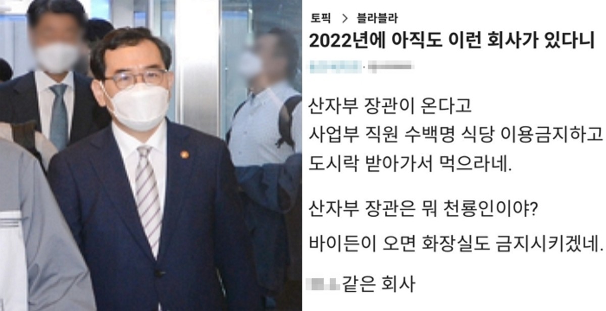 이날 A씨는 "산업부 장관이 온다고 직원 수백명(이 드나드는) 식당을 이용 금지하고 도시락 받아 가서 먹으라고 한다. 산업부 장관은 뭐 천룡인인가"라고 불만을 표했다.