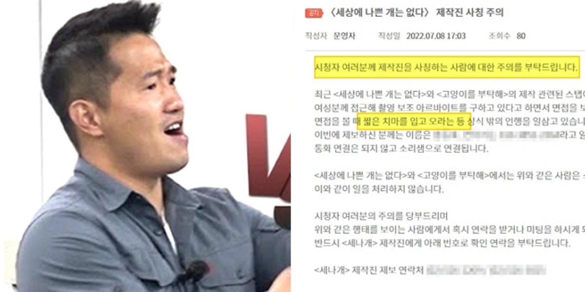 [인사이트] 성동권 기자 = EBS '세상에 나쁜 개는 없다(세나개)'의 제작진을 사칭해 여성들에게 접근하는 사례가 발생했다.