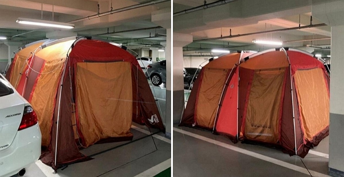 해당 글에 따르면 한 아파트 입주민은 주차 공간에 맞춰 텐트를 설치했다.