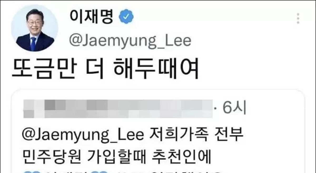 앞서 이 고문은 "가족들이 민주당원에 가입할 때 추천인에 이재명을 쓰라고 했다"는 트위터 글에 "또금만 더 해두때여"라고 애교를 부린 바 있다.