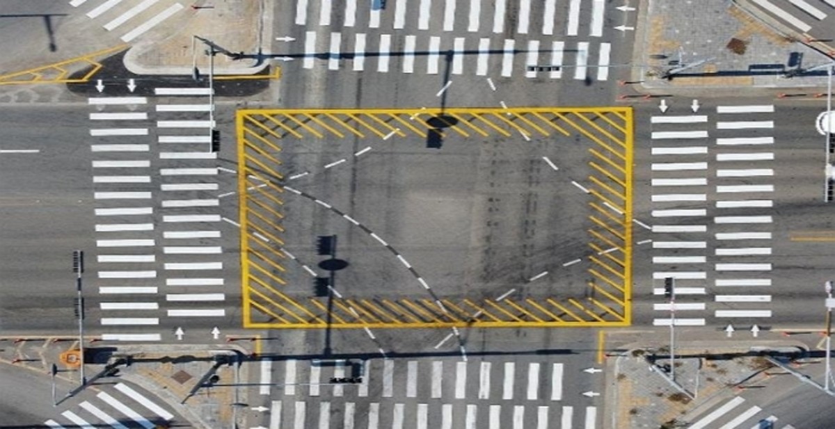 통행량이 많은 광장이나 교차로 중앙에 50~150cm 빗금이 쳐진 네모 칸을 설치해 도로 내에서 '꼬리물기'를 하는 차량들을 방지한다.