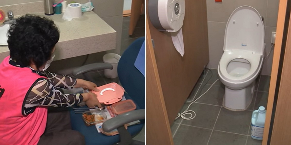 청소노동자들의 식사는 화장실 세면대 앞에서 의자를 식탁 삼아 이뤄졌다. 변기와 세면대 사이 좁은 공간에서 끼니를 때워야 했다.
