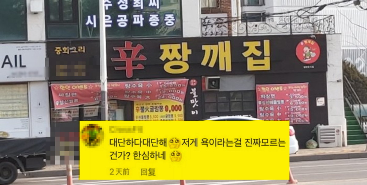 이들은 '짱개집'이라 적힌 간판을 보고 "부끄러운 줄 모른다", "뜻도 모르냐", "뭣도 아닌데 열받네", "남조선에 XX들 많네", "상식이란 없군", "저게 욕이란 걸 모르나. 한심하다" 등 분노하는 반응을 보였다.