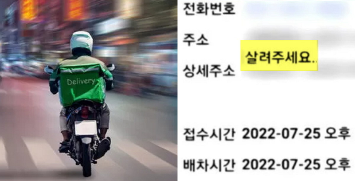 최근 한 배달 업체에서는 식당의 콜을 받았다. 콜 내용에는 '살려달라'는 위급한 내용이 적혀 있었다.