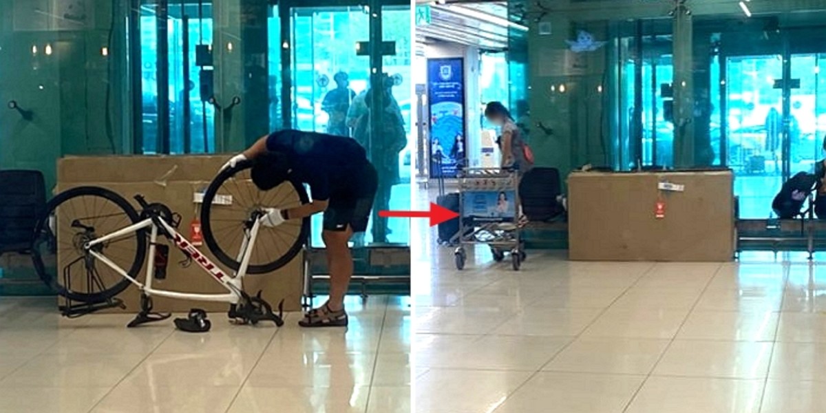 해당 게시글에 따르면 한 남성은 김포공항 출국장의 의자 앞에서 자전거를 조립하고 있었다.