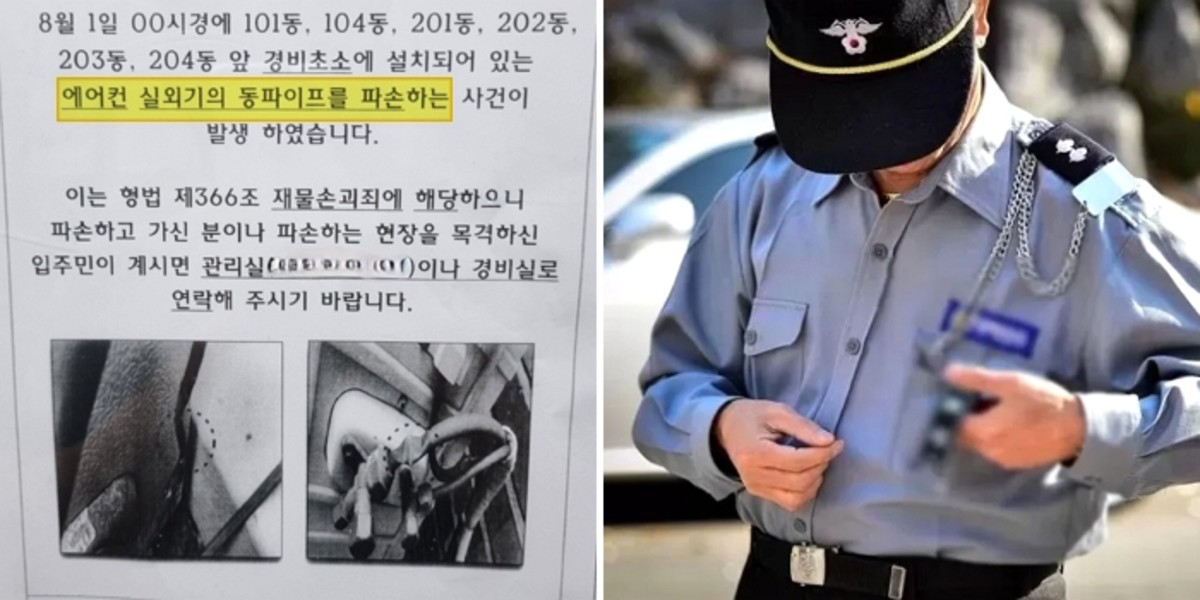 공지문에 따르면 지난 1일 새벽 12시경 6개 동의 경비초소에 설치되어 있는 에어컨 실외기의 동파이프가 파손됐다.