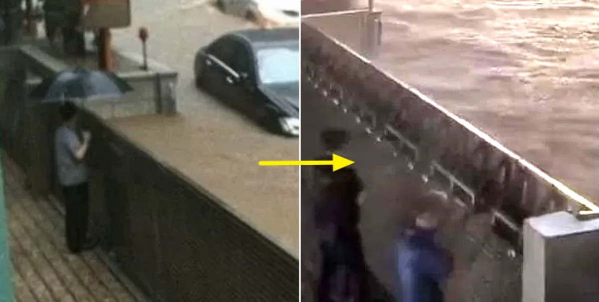 사진에는 도로가 침수돼서 차들이 떠내려가는 장면과, 이를 건물 안에서 평온히 지켜보는 이들의 모습이 담겨있었다.
