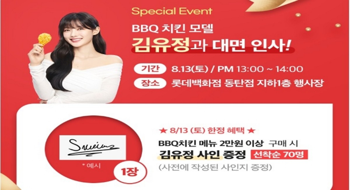 김유정은 오는 13일, 동탄 롯데백화점에서 진행하는 '제너시스BBQ 그룹대전' 팝업 스토어에 방문해 TV CF 온에어 이후 처음으로 팬들과 직접 소통하는 자리를 갖는다.