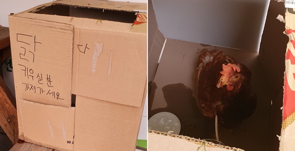 게시물에 따르면 닭이 발견된 때는 저녁 시간대로 박스 겉면에는 "닭 키우실 분 가져가세요"라는 문구가 적혀 있었다. 박스 속에는 수탉 한 마리가 근엄하게 위를 바라보고 있다.
