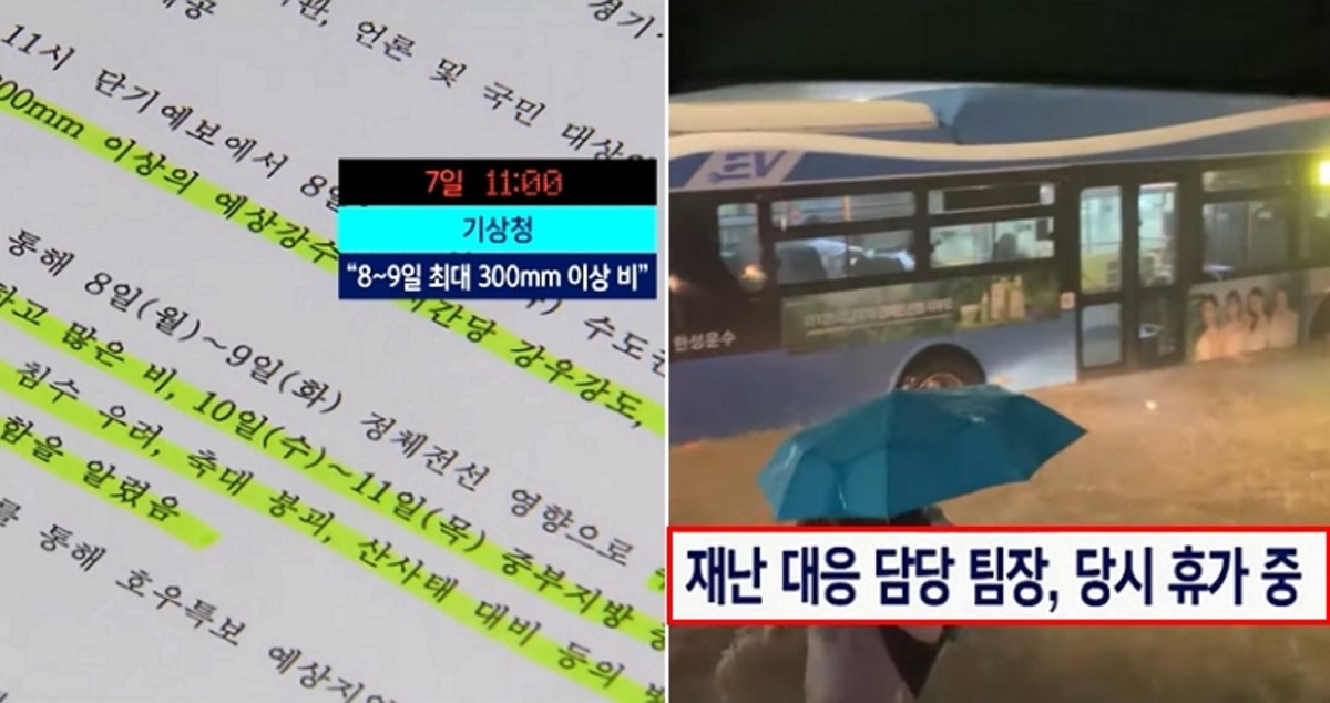 12일 SBS에 따르면 기상청은 폭우 하루 전날인 지난 7일 수도권 등에 최대 300mm 이상의 비가 예상돼 하천 범람, 침수, 산사태에 대비한 방재 대책이 필요하다는 내용을 대통령실에 보고했다는 내용을 담은 문건을 국회에 제출했다.