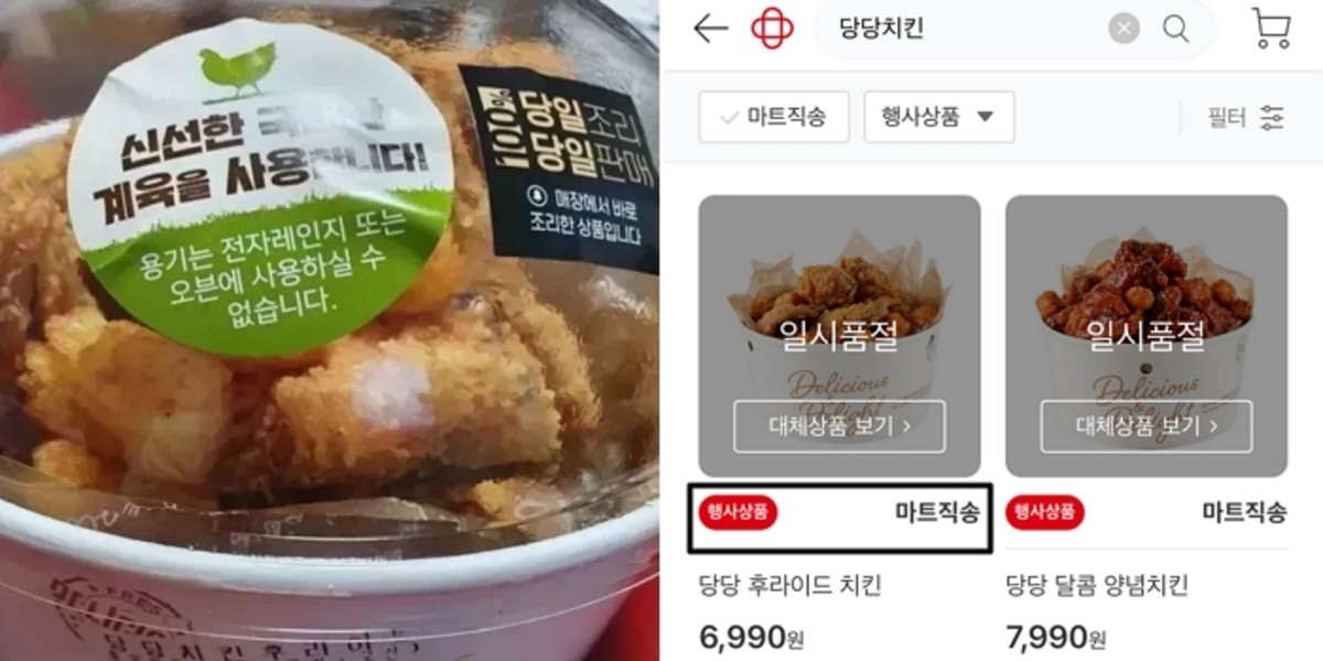 당당 후라이드 치킨과 당당 달콤 양념치킨에 대해 '행사 상품'임이 표기됐고, 그 옆에 진한 글씨체로 '마트 직송'이란 글자를 확인할 수 있었다.