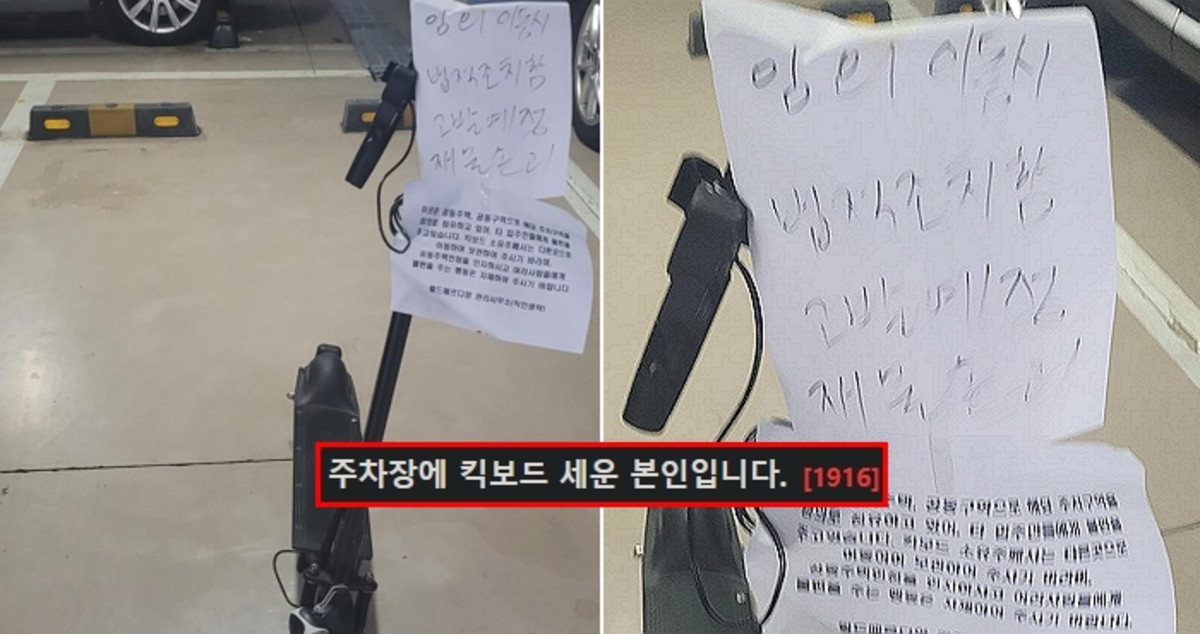 [인사이트] 함철민 기자 = 아파트 지하 주차장에 킥보드를 주차해 논란이 일고 있는 가운데 킥보드 주인이 직접 나서 본인의 주장을 전했다.
