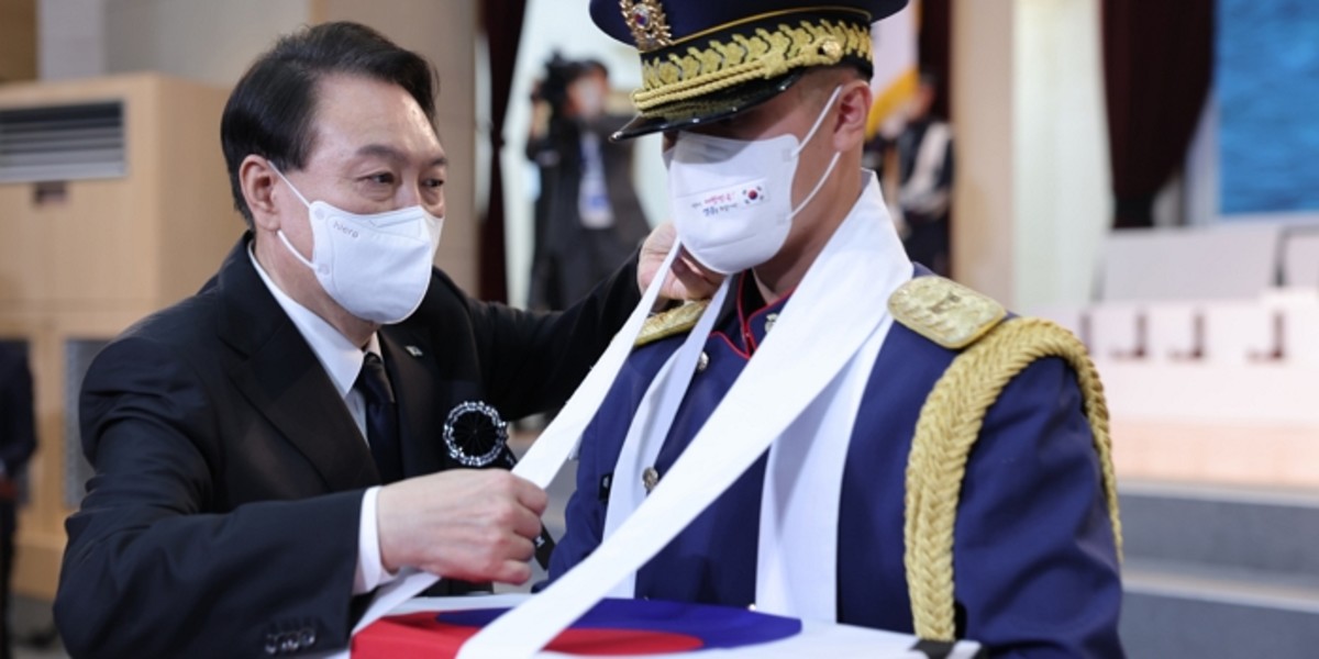 행사가 진행되던 도중 윤 대통령이 영현을 봉송하는 의장병에게 다가갔다. 이후 윤 대통령은 그가 안고 있던 유해함의 꼬인 끈을 직접 고쳐줬다.