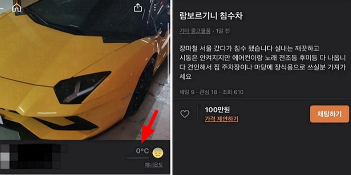 [인사이트] 유진선 기자 = 최근 쏟아진 폭우로 차량 침수 피해가 속출하는 가운데, 당근마켓에 침수된 람보르기니 차량을 판다는 글이 올라와 누리꾼들의 관심이 집중됐다.